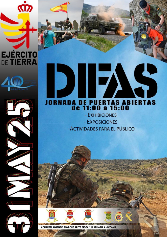 Con motivo de la celebración del Día de la Fuerzas Armadas se va a realizar una Jornada de Puertas Abiertas en el Acuartelamiento Soyeche el día 31 de mayo de 2025 a partir de las 11:00h. Desde el Club se organizará una salida gratuita en autobús para poder acudir cómodamente. Una vez en el acuartelamiento, los asistentes dispondrán de un tríptico informativo donde encontrarán la distribución de las exposiciones así como los horarios y localizaciones. Habrá actividades para los más pequeños.